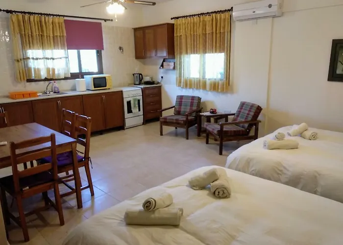 Affacciato sul giardino, il Sunset Guest House Kormakiti si trova a una distanza di 4 km da Horseshoe Beach di Kormakiti. Un giardino ornato da un barbecue arricchisce l'atmosfera dell'hotel a 3 stelle.